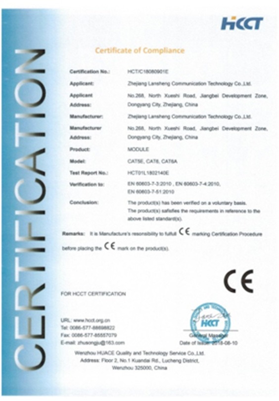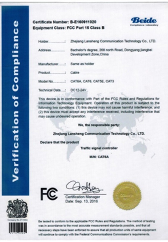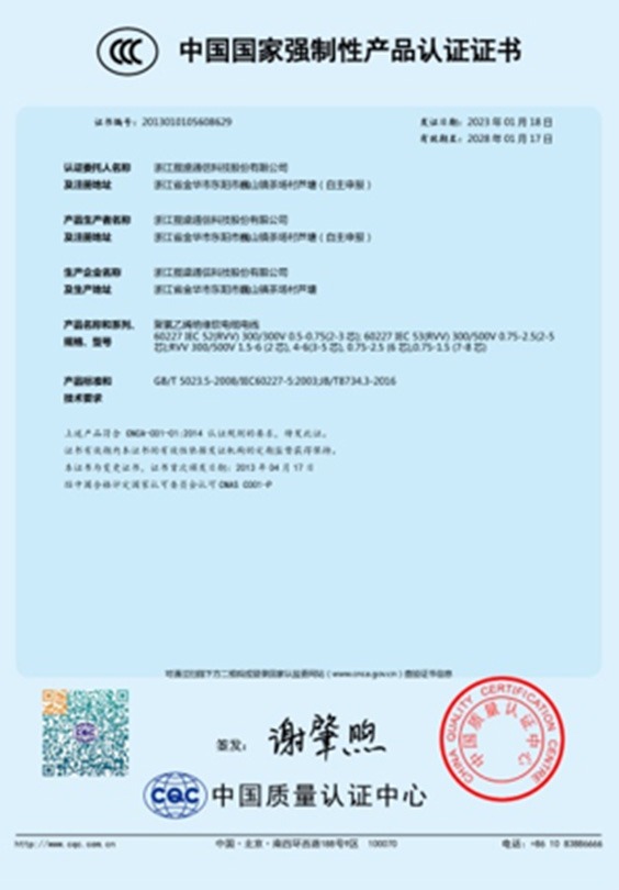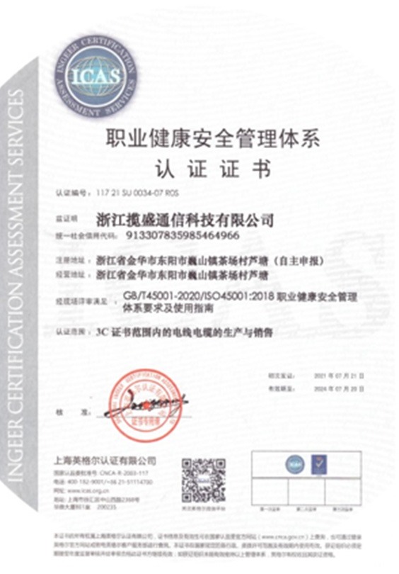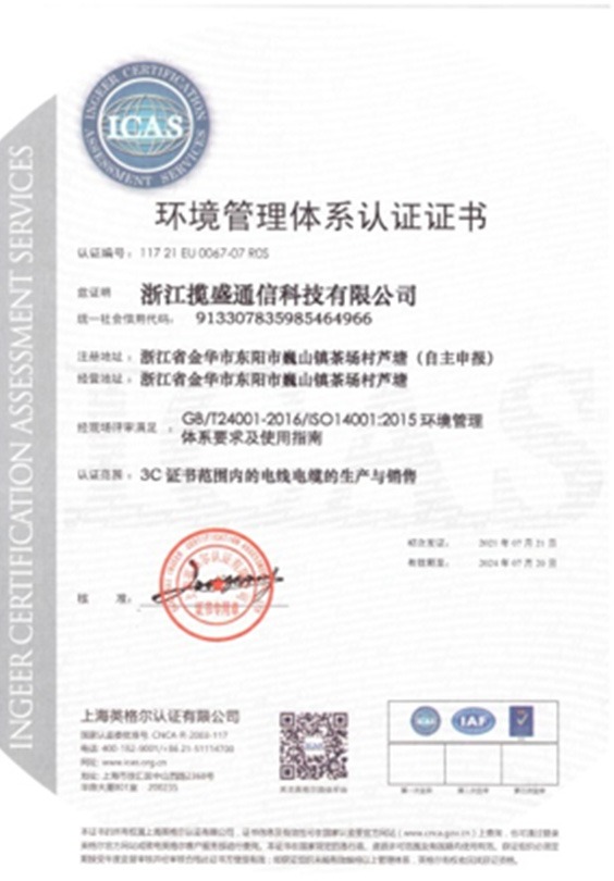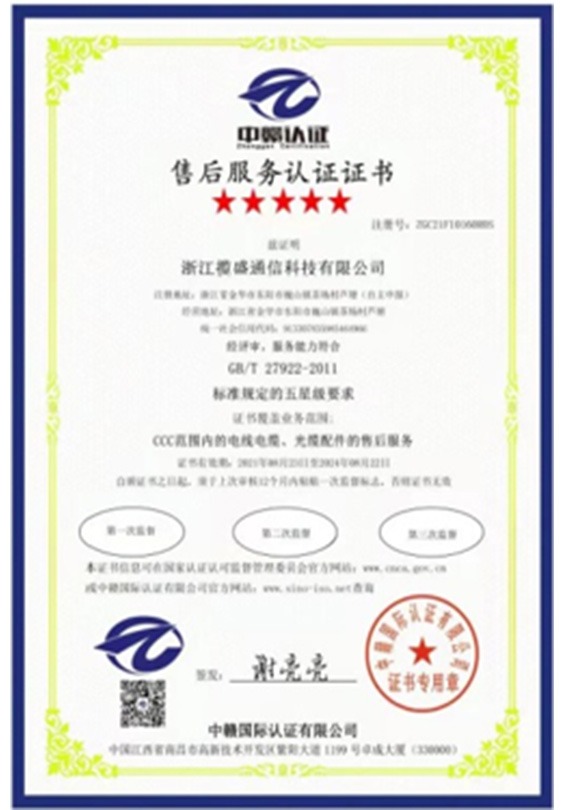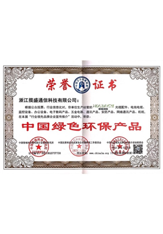 公司目前已通過3C強制性認證、ISO9001質量管理體系認證、ISO14001環境管理體系認證、ISO45001職業健康安全管理體系認證、五星售后服務體系認證、歐盟市場CE認證、ROHS、REACH、FCC等證書,2015年相繼榮獲綜合布線十大品牌和傳輸設備類(安防線纜)十大品牌稱號,2016年榮獲浙江省信用示范企業稱號,2017年獲得浙江省科技型中小企業、東陽市誠信品牌和誠信民營企業稱號,2019年成為國家高新技術企業。