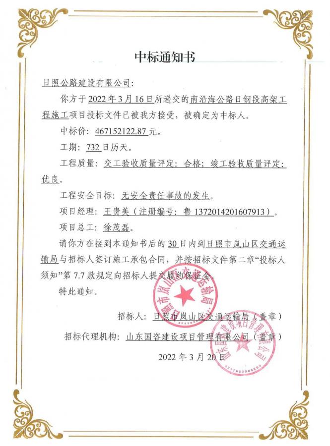 3月20日,集團(tuán)建設(shè)公司成功中標(biāo)南沿海公路日鋼段高架工程施工標(biāo)段,中標(biāo)價4.67億元。