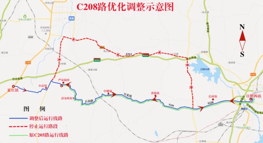 1.線路調(diào)整后,自夏莊發(fā)車,沿S225至石磊路東行,經(jīng)中樓鎮(zhèn)沿日夏線東行至S220崖頭村恢復(fù)原線路至日照西站。原C208路S225(石磊路至S313)、S313(S225至S222)和S222(S313至S220)路段往返停止運(yùn)行。