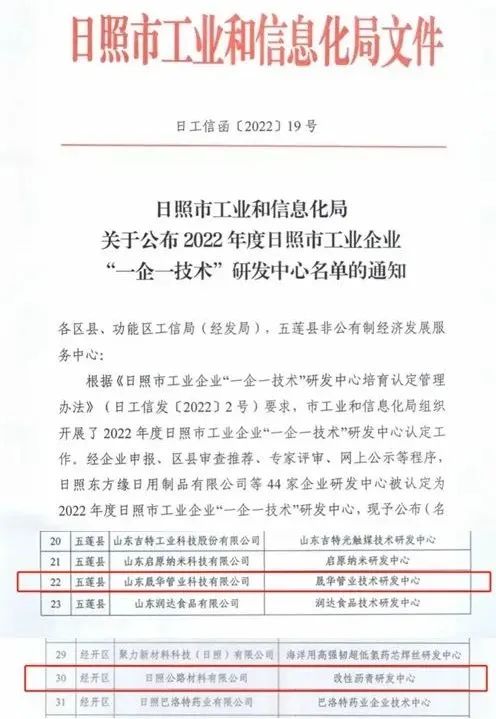 近日,日照市工業(yè)和信息化局印發(fā)《關(guān)于公布2022年日照市工業(yè)企業(yè)“一企一技術(shù)”研發(fā)中心名單的通知》,集團(tuán)材料公司和晟華管業(yè)公司榜上有名。