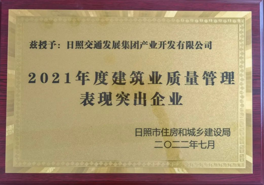 ,集團產(chǎn)業(yè)開發(fā)公司榮獲“2021年度建筑業(yè)質(zhì)量管理表現(xiàn)突出企業(yè)”榮譽稱號。