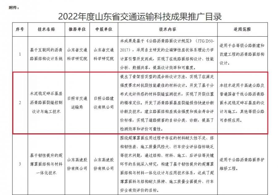 9月27日,省交通運輸廳發(fā)布2022年度山東省交通運輸科技成果推廣目錄,集團建設(shè)公司申報的《水泥穩(wěn)定碎石基層瀝青路面裂縫控制設(shè)計與施工技術(shù)》入選。