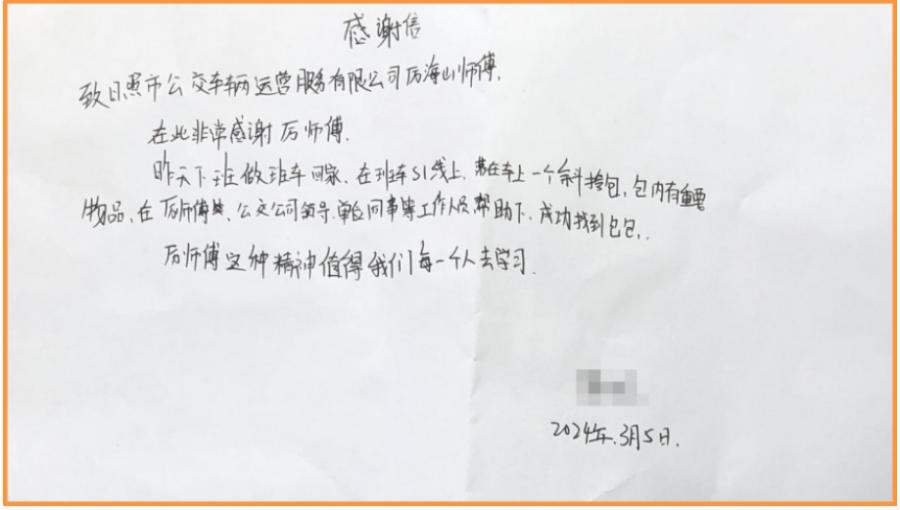 經(jīng)公司多方聯(lián)系找尋,失主盛先生帶著感謝信于當(dāng)天下午19時(shí)領(lǐng)回了遺失物品,接過(guò)失而復(fù)得的財(cái)物后,喜悅之情溢于言表。據(jù)了解,前一日早晨盛先生因匆忙下車遺漏個(gè)人物品,發(fā)現(xiàn)自己隨身攜帶的灰色手提包丟失后,苦苦尋找無(wú)果。恰好此時(shí)接到車輛運(yùn)營(yíng)公司失物招領(lǐng)信息,“多虧了好心的班車司機(jī)厲師傅,可把我急壞了,真的很幸運(yùn)遇到這樣負(fù)責(zé)任、拾金不昧的好人啊,真的要好好謝謝他!”失主盛先生連聲說(shuō)道。