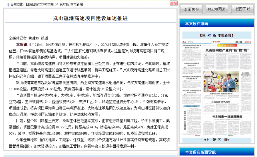 “該項(xiàng)目全線設(shè)特大橋1座、大橋1座、中橋2座,新增互通立交3處,改建樞紐互通立交1處、分離立交2座、主線收費(fèi)站1處、匝道收費(fèi)站1處、養(yǎng)護(hù)工區(qū)1處、路段監(jiān)控通信分中心1處。”張樹松表示,項(xiàng)目建成后,將實(shí)現(xiàn)日照港嵐山港區(qū)與嵐羅高速、沈海高速等路網(wǎng)的快速直連,為嵐山港區(qū)提供快速的集疏運(yùn)通道,提高港區(qū)運(yùn)輸服務(wù)效率,促進(jìn)沿線經(jīng)濟(jì)發(fā)展。