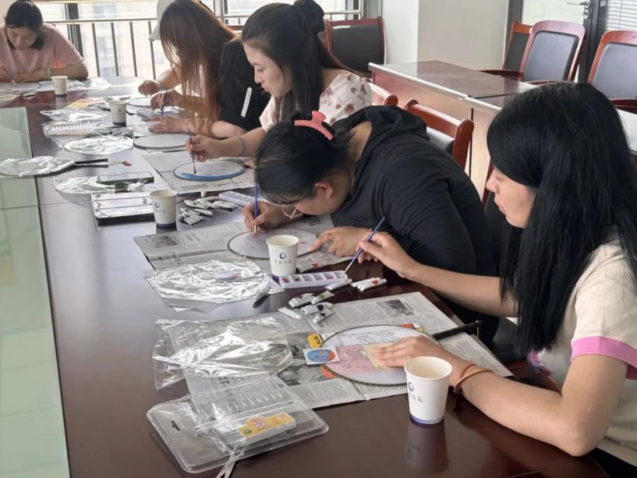 活動(dòng)現(xiàn)場(chǎng),職工們以漆作畫,以扇為紙,在了解了非遺漆扇的歷史淵源、制作工藝和文化內(nèi)涵后,紛紛挑選自己喜愛(ài)的漆色,在白面團(tuán)扇上提筆作畫,夢(mèng)幻的色彩躍然紙上,一把精美的漆扇便制作完成。