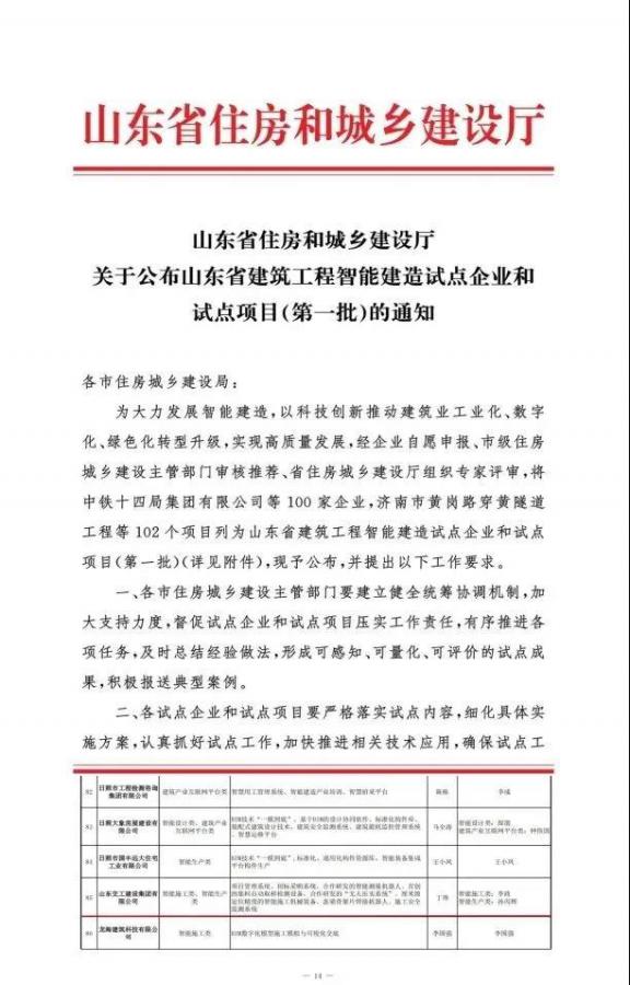 近日,山東省住房和城鄉(xiāng)建設(shè)廳公布山東省建筑工程智能建造試點(diǎn)企業(yè)和試點(diǎn)項(xiàng)目(第一批)名單,山東交工建設(shè)集團(tuán)入選山東省建筑工程智能建造試點(diǎn)企業(yè)(第一批)。
