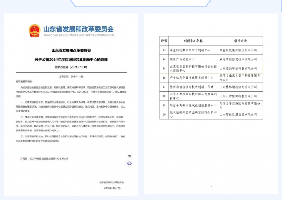 近日,山東省發(fā)展和改革委員會(huì)公布了2024年度省級(jí)服務(wù)業(yè)創(chuàng)新中心認(rèn)定結(jié)果,集團(tuán)藍(lán)能科技公司技術(shù)創(chuàng)新中心成功入選。
