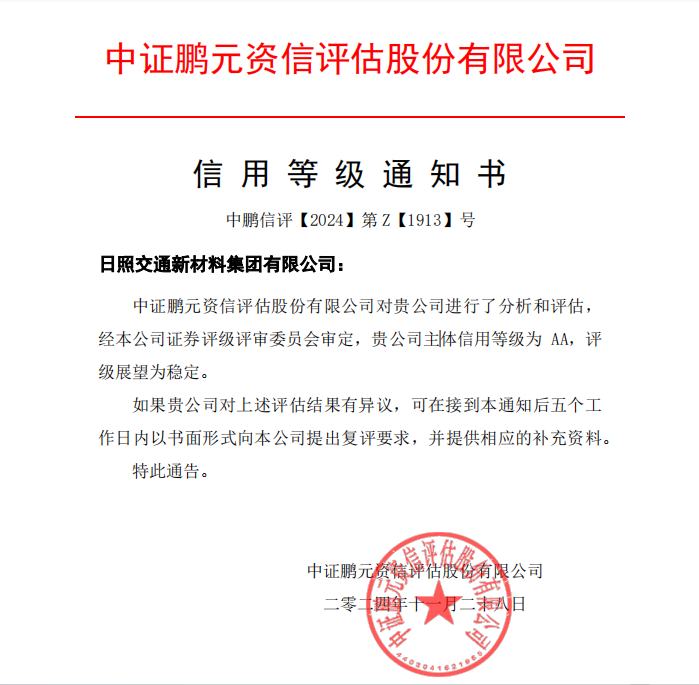 11月28日,經(jīng)中證鵬元資信評估股份有限公司評估審定,日照交通新材料集團有限公司獲評AA主體信用評級。