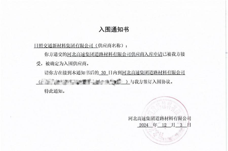 同日,新材料集團(tuán)被河北高速集團(tuán)道路材料有限公司確定為入圍供應(yīng)商。