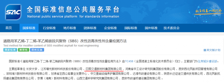 近日,由長安大學(xué)主編,日照交通新材料集團有限公司等單位參與編寫的國家技術(shù)標(biāo)準(zhǔn)《GB/T45464-2025道路用苯乙烯-丁二烯-苯乙烯嵌段共聚物(SBS)改性瀝青改性劑含量檢測方法》發(fā)布,將自2025年10月1日起實施。