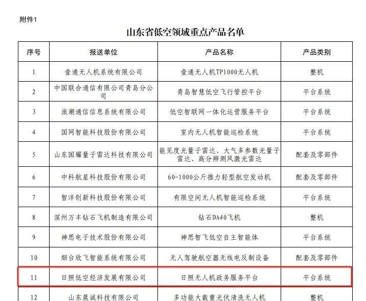 其中,集團(tuán)低空經(jīng)濟(jì)公司報(bào)送的“日照無(wú)人機(jī)政務(wù)服務(wù)平臺(tái)”名列低空領(lǐng)域重點(diǎn)產(chǎn)品名單。