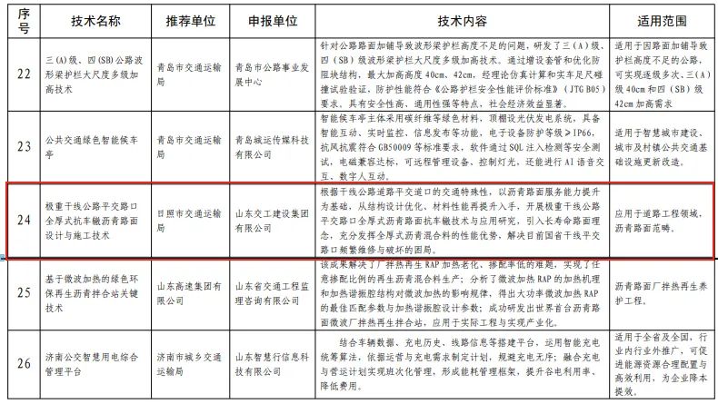 近日,山東省交通運(yùn)輸廳發(fā)布2025年度《山東省交通運(yùn)輸科技成果推廣目錄》,集團(tuán)所屬山東交建集團(tuán)申報(bào)的《極重干線(xiàn)公路平交路口全厚式抗車(chē)轍瀝青路面設(shè)計(jì)與施工技術(shù)》成功入選。