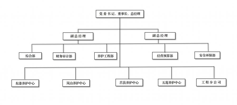 公司設(shè)綜合部、財務(wù)審計部、養(yǎng)護工程部、經(jīng)營預(yù)算部、安全環(huán)保部5個部室,東港、嵐山、莒縣和五蓮4個養(yǎng)護中心,1個工程分公司,1個綠化分公司,全市布設(shè)10個養(yǎng)護工區(qū)。