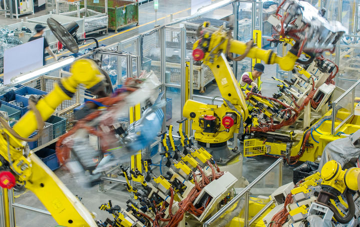 2025年10月9日,浙江省湖州市長(zhǎng)興經(jīng)濟(jì)技術(shù)開發(fā)區(qū)的長(zhǎng)興地通汽車部件有限公司技術(shù)人員操控工業(yè)機(jī)器人生產(chǎn)新能源汽車配件(無人機(jī)照片)。新華社發(fā)(譚云俸攝)
