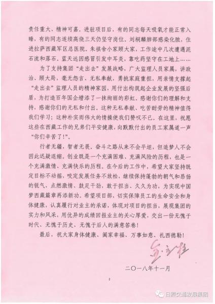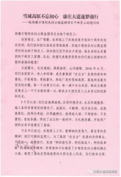 金董事長的慰問信,從黃海之濱的港城大地,穿越萬水千山,到達高寒缺氧的雪域高原,為冬日里奮戰(zhàn)的監(jiān)理人員帶去了集團的溫暖和力量。西藏日喀則農(nóng)村公路監(jiān)理項目全體干部員工倍感振奮和自豪,紛紛表示一定要繼續(xù)發(fā)揚“特別能吃苦、特別能戰(zhàn)斗、特別能奉獻”的港城鐵軍精神,認真履行對業(yè)主的承諾,體現(xiàn)對項目的擔(dān)當(dāng),以過硬的質(zhì)量和優(yōu)異的成績回饋業(yè)主和領(lǐng)導(dǎo)的關(guān)心厚愛。