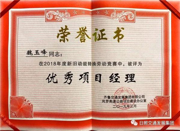 3月2日,在齊魯交通發(fā)展集團嵐羅高速項目2019年加快工程建設(shè)動員大會上,建設(shè)公司嵐羅高速一合同項目部被評為“2018年度優(yōu)秀施工單位”、“2018年決戰(zhàn)四季度先進單位”,在2018年度考核中勇奪第一,獲得獎勵金50萬元。魏玉峰同志榮獲“優(yōu)秀項目經(jīng)理”稱號,左希文、張數(shù)松榮獲“項目管理先進工作者”稱號,焦淑波榮獲“安全管理先進工作者”稱號,郭輝班組榮獲“優(yōu)秀施工班組”稱號。