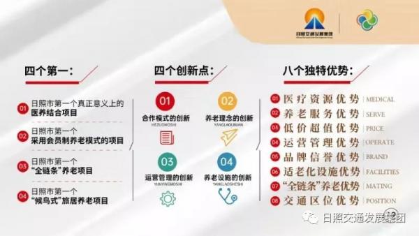 頤養(yǎng)健康產(chǎn)業(yè)綜合體項目,是集團(tuán)創(chuàng)新醫(yī)養(yǎng)結(jié)合健康養(yǎng)老新路徑,與市醫(yī)院合力打造的高端養(yǎng)老產(chǎn)業(yè)項目,是日照市第一個真正意義上的醫(yī)養(yǎng)結(jié)合項目、第一個采用會員制養(yǎng)老模式的項目、第一個“全鏈條”養(yǎng)老項目、第一個“候鳥式”旅居養(yǎng)老項目,具有四個創(chuàng)新點、八個獨特優(yōu)勢。