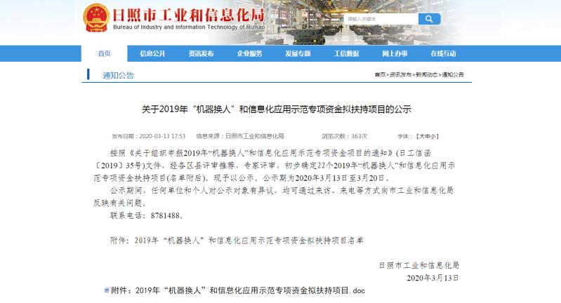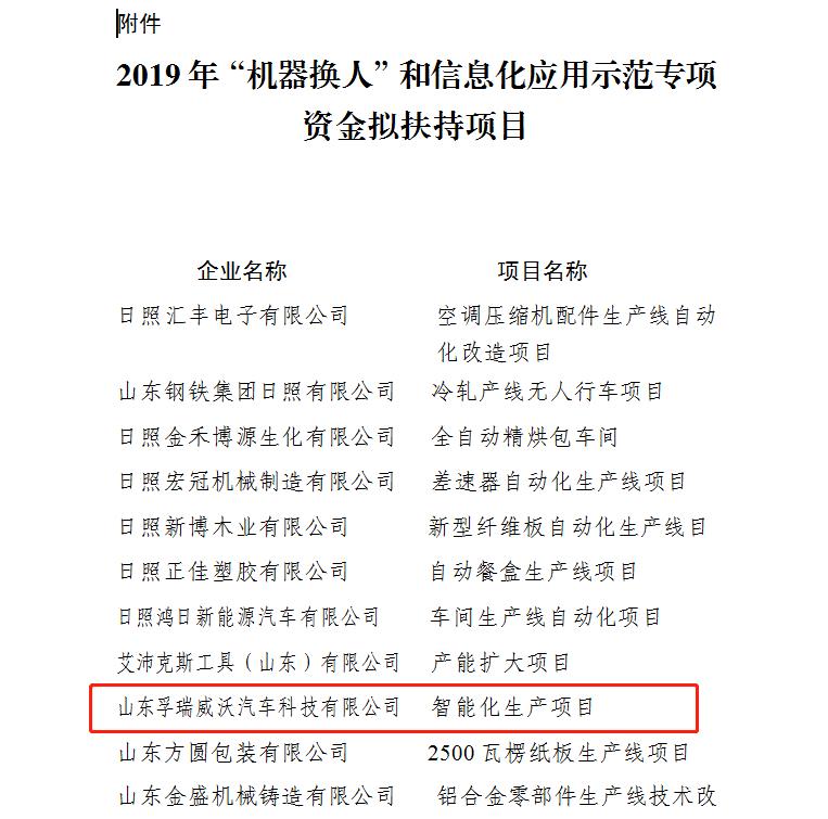 近日,集團(tuán)海通威沃汽車科技有限公司“智能化生產(chǎn)項目”被列為日照市2019年“機(jī)器換人”和信息化應(yīng)用示范專項資金扶持項目,獲得扶持資金44.5萬元。
