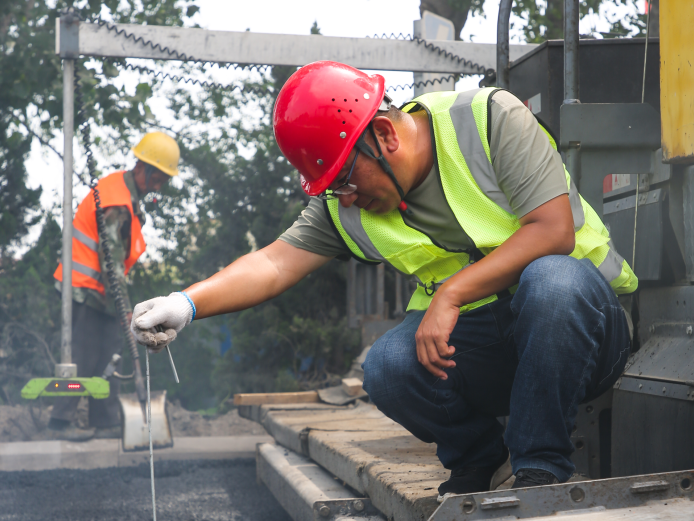 身著橘紅色工裝的一線員工們,正汗流浹背地進(jìn)行攤鋪施工。盛夏酷暑,瀝青路面溫度已高達(dá)60多攝氏度,從自卸車斗卸下的瀝青混合料更是高達(dá)一百五六十度以上,攤鋪機(jī)經(jīng)過(guò)之處彌漫起一陣青灰色的煙塵。就在“上烤下蒸”的模式下,一線員工滿頭汗水順著臉頰淌下,身上的汗堿在布滿油污與灰塵的工作服上干了一圈,又濕了一圈,生成了一幅“鹽堿地圖”。但他們一絲不茍按照規(guī)范施工,加班加點(diǎn)、搶趕工期,齊心協(xié)力抓好施工任務(wù)。