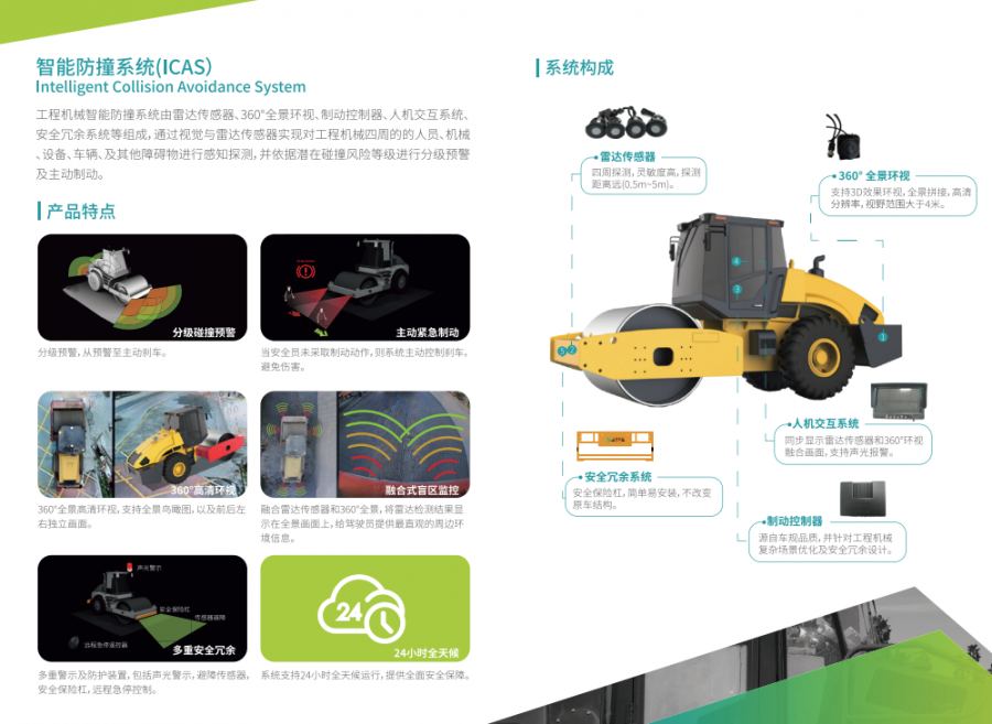 “工程機械智能防撞系統(tǒng)”由雷達傳感器、360°全景環(huán)視、制動控制器、人機交互系統(tǒng)、安全冗余系統(tǒng)等組成,通過視覺與雷達傳感器實現(xiàn)對工程機械四周的人員、機械、設(shè)備、車輛及其他障礙物進行感知探測,并依據(jù)潛在碰撞風(fēng)險等級進行分級預(yù)警及主動制動。