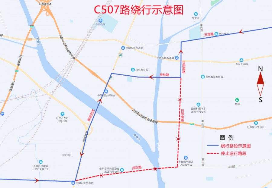 調(diào)整后,原日照南路(桂林路至深圳路)、深圳路(日照南路至G204)路段往返暫停運(yùn)行。調(diào)整為由日照南路向南,至桂林路向西,至和陽(yáng)南路向南,至深圳路向西恢復(fù)原線路往返運(yùn)行。