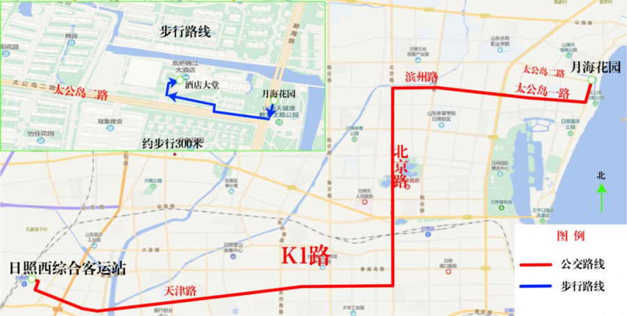 乘坐高鐵乘客可在日照西綜合客運(yùn)站下車后,到公交換乘中心乘坐K1路到“月?;▓@”站下車(返程時(shí),同站上車),站點(diǎn)西側(cè)為嵐橋錦江大酒店,從站點(diǎn)步行300米即可到達(dá)酒店大堂。