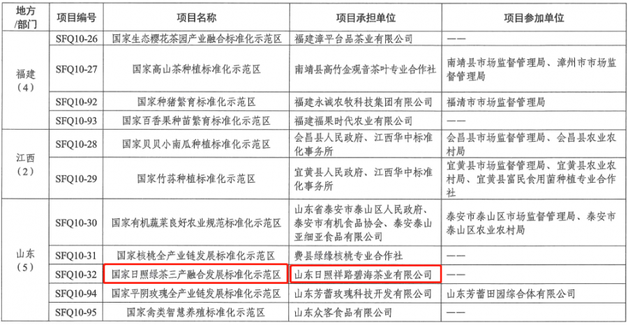 近日,國家標準化管理委員會公示國家第十批農業(yè)標準化示范區(qū)項目考核結果,集團祥路碧海茶業(yè)公司獲評“國家日照綠茶三產融合標準化示范區(qū)”。