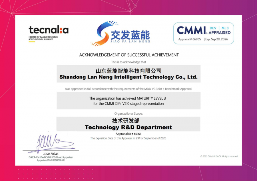 近日,集團(tuán)藍(lán)能科技公司順利通過(guò)CMMI3級(jí)認(rèn)證,此次認(rèn)證是公司軟件研發(fā)規(guī)范化的重要里程碑。
