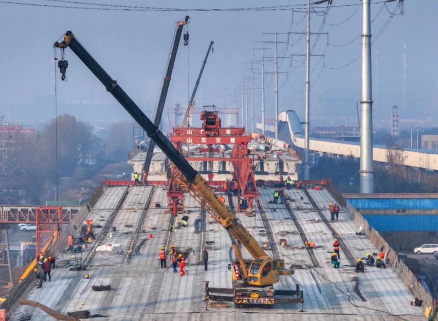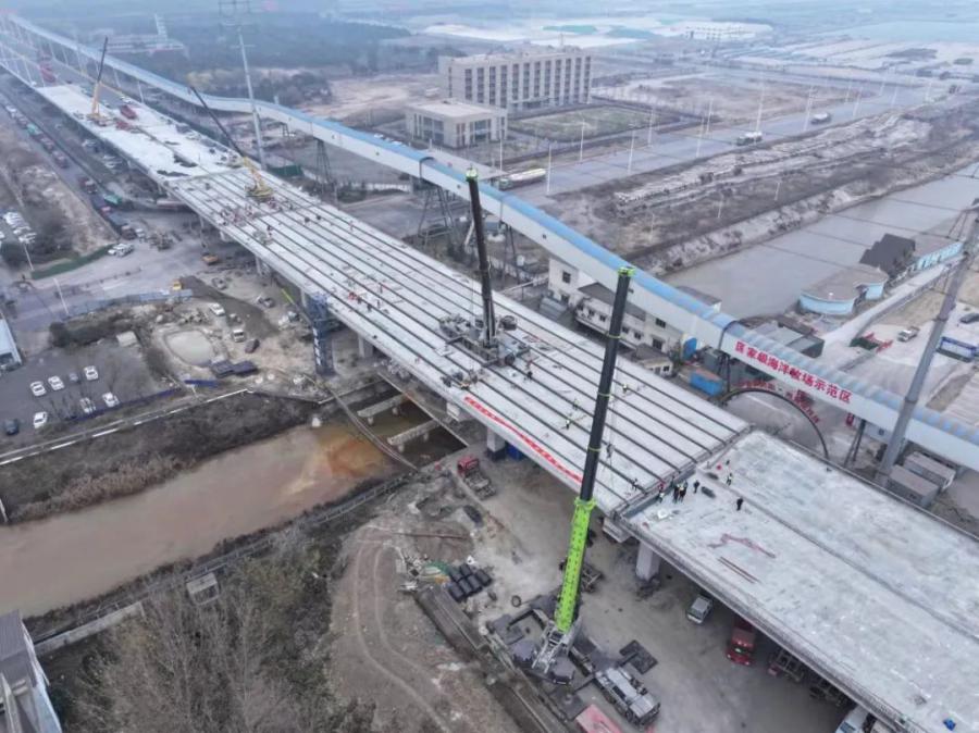 12月9日,隨著兩臺大型起重機(jī)將南沿海公路日鋼段高架工程K1+820最后一片箱梁準(zhǔn)確吊裝到位,高架橋549片箱梁安裝全部完成。