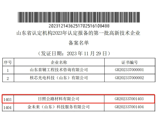 12月18日,全國高新技術(shù)企業(yè)認(rèn)定管理工作領(lǐng)導(dǎo)小組辦公室發(fā)布了《山東省認(rèn)定機(jī)構(gòu)2023年認(rèn)定報(bào)備的第一批高新技術(shù)企業(yè)備案名單》,集團(tuán)材料公司順利通過國家高新技術(shù)企業(yè)復(fù)審認(rèn)定。