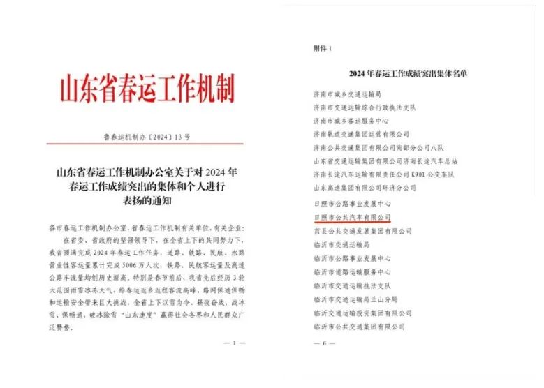 近日,山東省春運工作機制辦公室印發(fā)《關(guān)于對2024年春運工作成績突出的集體和個人進行表揚的通知》,集團公共汽車公司被評為“2024年春運工作成績突出集體”。
