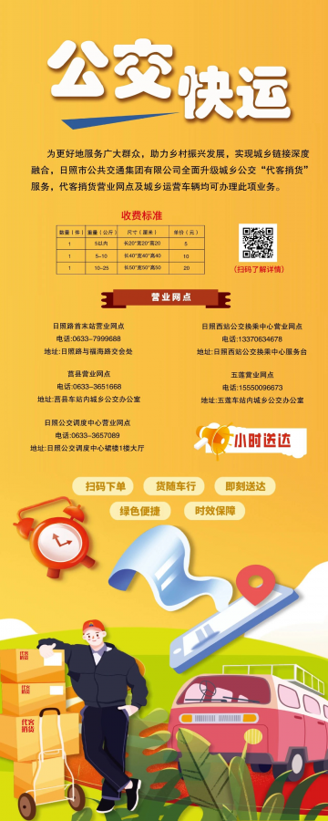 網(wǎng)點(diǎn)投遞 為便利市民投遞貨物,公司分別在日照路首末站、日照西綜合客運(yùn)站公交換乘中心、莒縣汽車站、五蓮汽車站、日照公交調(diào)度中心設(shè)立5處代客捎貨便民服務(wù)網(wǎng)點(diǎn),竭誠為城鄉(xiāng)百姓提供安全、高效、便捷的貨物攬收、寄遞服務(wù),歡迎廣大市民前往體驗(yàn)!