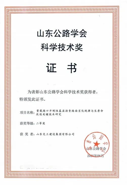 近日,山東公路學(xué)會(huì)組織評(píng)選的2025年度“山東公路學(xué)會(huì)科學(xué)技術(shù)獎(jiǎng)”獲獎(jiǎng)名單正式揭曉,山東交建集團(tuán)聯(lián)合省交通科學(xué)研究院、市公路事業(yè)發(fā)展中心共同申報(bào)的創(chuàng)新成果——《重載路口半剛性基層瀝青路面劣化規(guī)律與長(zhǎng)壽命改造關(guān)鍵技術(shù)研究》榮獲科技創(chuàng)新獎(jiǎng)二等獎(jiǎng)。