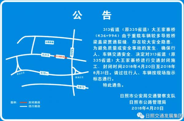 大王家寨中橋位于313省道(原335省道)三莊鎮(zhèn)大王家寨村西,舊橋長75.14m,寬19 m?,F(xiàn)對(duì)舊橋?qū)嵤┎鸪?,新建一?×13m 簡支梁橋。該工程4月20日發(fā)布全封閉施工公告,封閉時(shí)間為4月20日—8月31日。